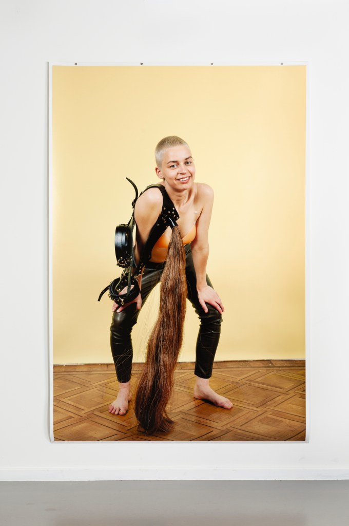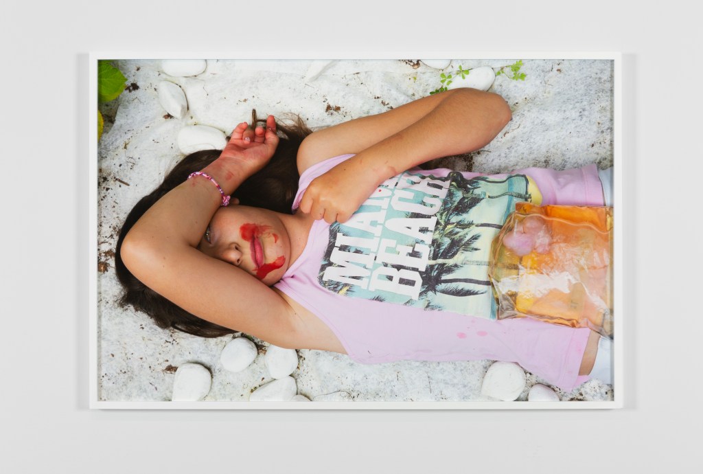 Dans la série Centauresse, Laure Cottin Stefanelli nous présente des personnages soigneusement mis en scène qui séduisent le spectateur, non sans provoquer un certain malaise. Le titre fait référence au personnage mythologique mi-humain mi-cheval, incarnant la coexistence de deux natures opposées qui ont besoin l’une de l’autre pour survivre. À travers son objectif, elle relie des éléments disparates, tels qu’une doublure en soie rouge, un crapaud et une jeune adolescente. Elle utilise des motifs subtils et des couleurs récurrentes qui questionnent la prétention d’objectivité du médium photographique. Les surfaces lisses et brillantes, les textures crues et les poses aguicheuses de sujets animés et inanimés créent un rébus visuel, une constellation qui nous fait expérimenter son travail pas uniquement avec le regard, mais avec tous nos sens. On se rapproche, attiré par la tactilité des images, jusqu’à se retrouver saisi par un jeu puissant – érotique ? –dans lequel les personnages, l’appareil photo et le spectateur exercent à tour de rôle l’acuité de leurs regards.